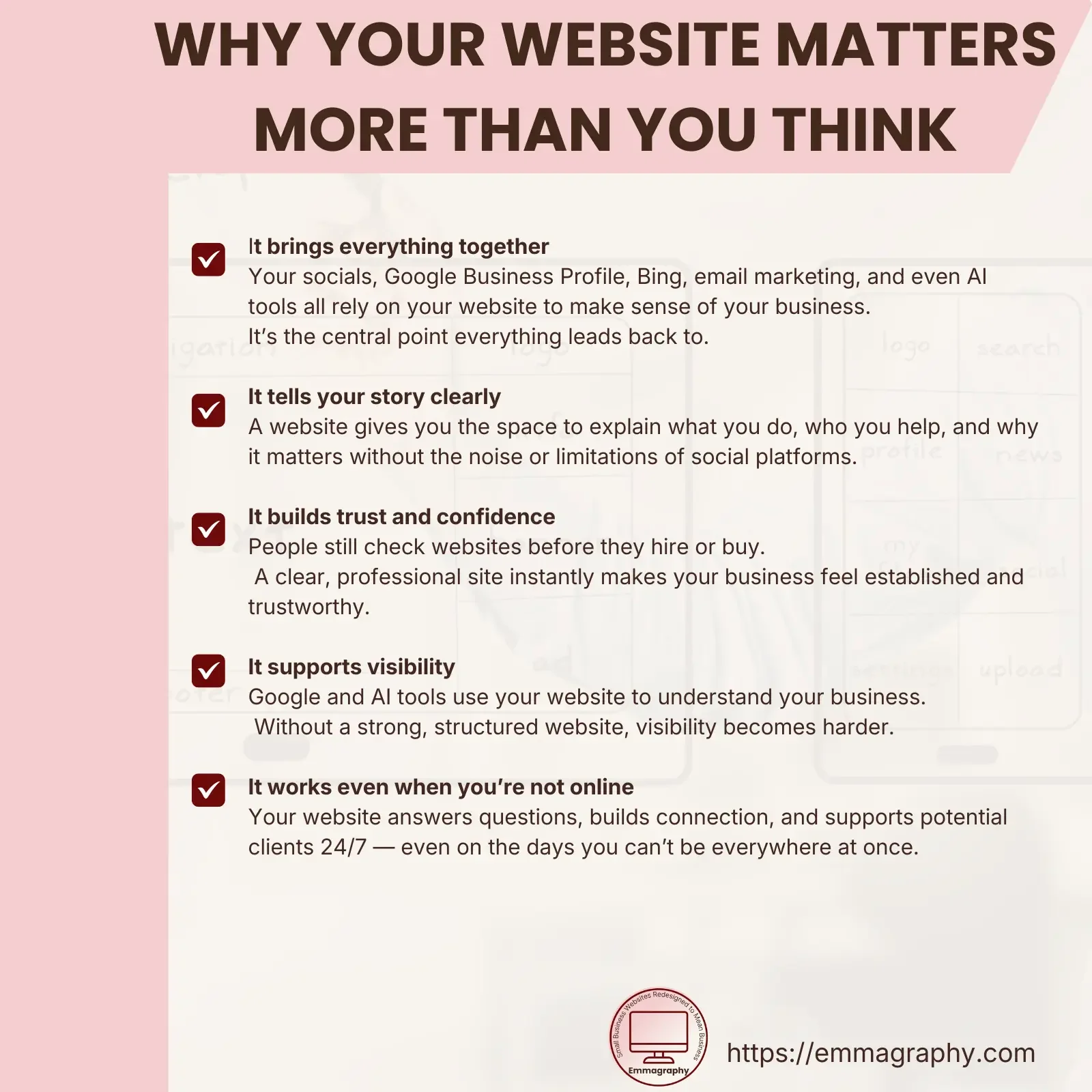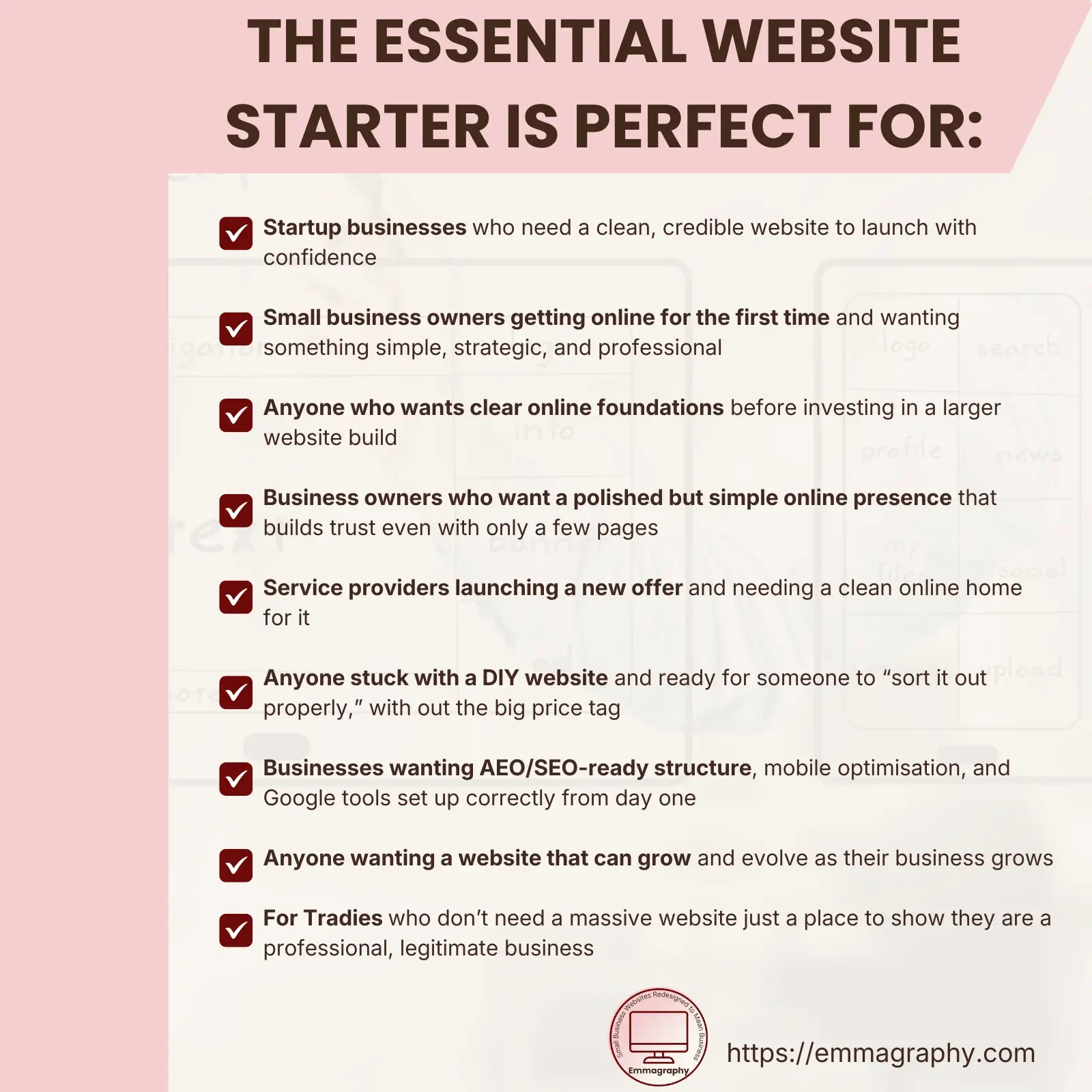 The Essential Website Starter is the perfect first step if you’re ready to get your business online with clarity and confidence — without the overwhelm or the investment of a full build.