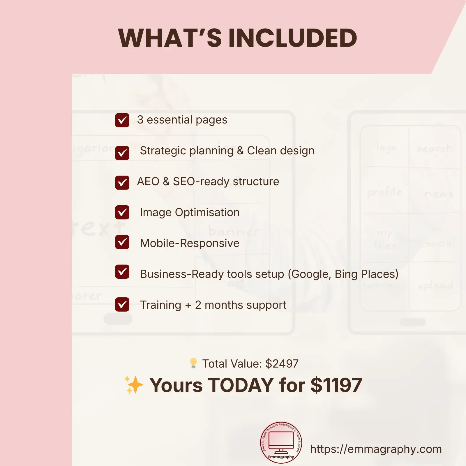 Start with a simple, strategic website that gives your business a professional online presence built with foundational SEO/AI Readiness, clarity, and your audience in mind. Total investment: $1,197 upfront Or: 3 x $335 monthly payments